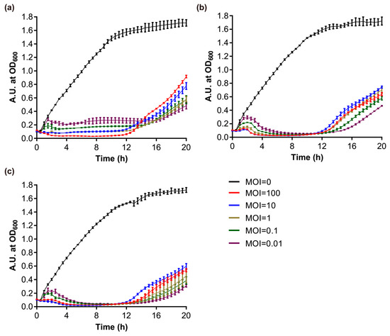 Growth curves of PAO1 strains infected with different phages. (a) vB_PaeM_SCUT-S1 of different MOIs; (b) vB_PaeM_SCUT-S2 of different MOIs; (c) vB_PaeM_SCUT-S1 and vB_PaeM_SCUT-S2 were combined in a 1:1 ratio to the indicated final MOIs.
