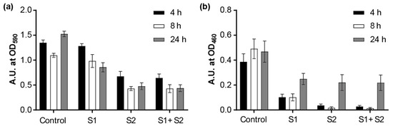 Effect of phage treatment on 24-h-grown biofilms. (a) Biomass evaluation by CV staining; (b) metabolic activity evaluation by XTT assay. Control: without any phages; S1: treated with 108 pfu of phage vB_PaeM_SCUT-S1; S2: treated with 108 pfu phage vB_PaeM_SCUT-S2; S1 + S2: treated with a mixture of vB_PaeM_SCUT-S1 and vB_PaeM_SCUT-S2 (0.5 × 108 pfu of each phage). The different treatment duration is indicated by different bar colors.