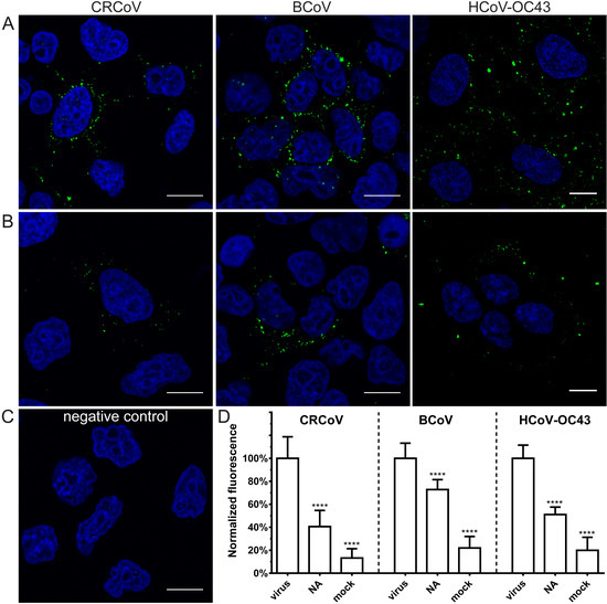 Removal of SAs from the surface of the cell limits attachment of HCoV-OC43 VR-1558, BCoV, and CRCoV to different extent. Cells pretreated with type II neuraminidase (NA, 200 mU/mL) were overlaid with HCoV-OC43, BCoV, and CRCoV stocks, incubated for 2 h at 4 °C, fixed, and immunostained. Viral capsids are presented in green, while blue denotes DNA. Scale bar 10 µm. Data were collected from a minimum of 12 fields of view, from at least three different samples. (A) virus inoculated, control cells; (B) virus inoculated, NA treated cells; (C) mock inoculated, non-treated cells; (D) FACS analysis of viral attachment in the presence of NA. Graph shows mean fluorescence normalized to control. The data is presented as mean ± SD from at least three experiments in triplicate. (* p < 0.05; ** p < 0.01; *** p < 0.001; **** p < 0.0001).