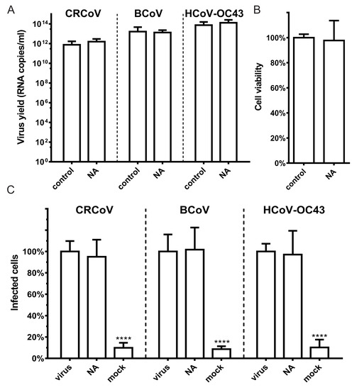To determine the role of SAs during CRCoV, BCoV, and HCoV-OC43 entry, we treated cells with neuraminidase (NA) prior to infection and then examined viral replication. Removal of SAs with NA had no effect on viral replication (Figure 4).