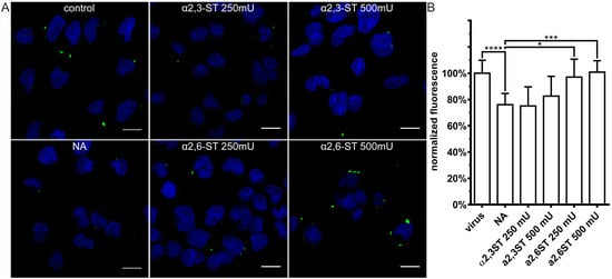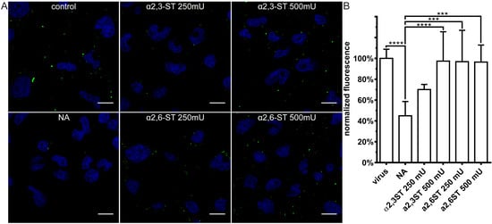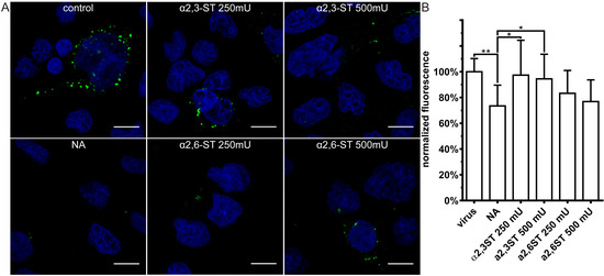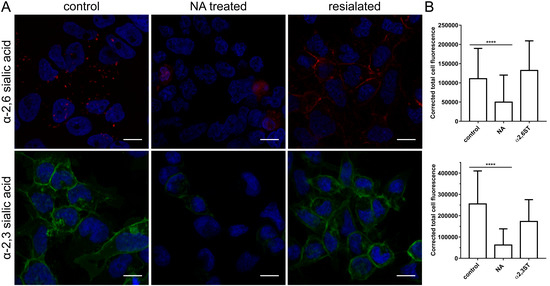 To confirm that the observed effect was SA-specific, we stripped and then restored SAs to the cell surface. First, HRT-18G cells were treated with NA to remove SAs. Then, the cells were incubated for 2 h at 37 °C with α-2,3-sialyltransferase (α2,3-ST) or α-2,6-sialyltransferase (α2,6-ST) in the presence of 1 mM of cytidine-5′-monophospho-N-acetylneuraminic acid sodium salt (CMP-Neu5Ac). Compounds’ activity was verified using α-2,3-SAs and α-2,6-SAs specific lectins (Figure 6).