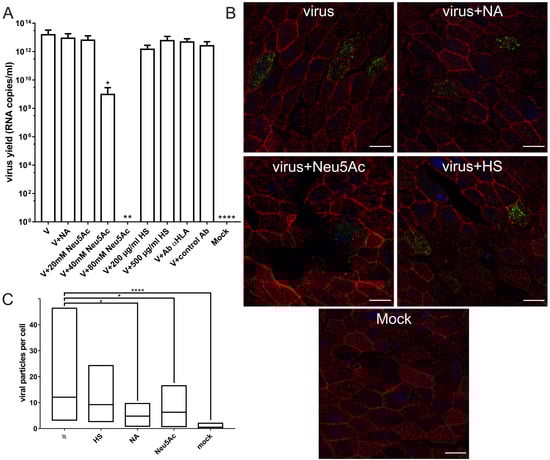 To ensure that obtained results are valid and that reconstitution of the SAs on cell surface or incomplete scission of the SAs by NA does not affect the outcome, the infection was carried out in the presence of soluble SAs (Neu5Ac) prior to infection. The role of SAs during virus attachment and lack of effect on replication was confirmed for all three viruses (Figure 5).
