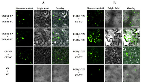 Bimolecular fluorescence complementation (BiFC) assays were conducted in N. benthamiana leaves. At 48 hpi, YFP fluorescence signals in infiltrated leaf cells were visualized under confocal microscopy. In accordance with results obtained in the Y2H assays, fluorescence signals were observed in the leaf cells coinfiltrated with the paired homologous proteins TGBp1-YN/TGBp1-YC, TGBp2-YN/TGBp2-YC and CP-YN/CP-YC (Figure 3A) and the heterogonous protein combinations TGBp1-YN/TGBp2-YC, CP-YC/TGBp1-YN, CP-YC/TGBp2-YN, and CP-YC/TGBp3-YN (Figure 3B). There was no fluorescent signal detected in leaf cells coinfiltrated with the paired homologous proteins YN/YC (negative control) (Figure 3A) and combinations TGBp3-YN/TGBp3-YC, TGBp1-YN/TGBp3-YC, and TGBp2-YN/TGBp3-YC (Figure S1). These results further confirmed the protein-protein interactions identified in the Y2H assays.