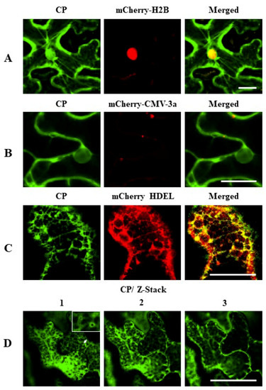 The subcellular localization of CYVCV proteins in the epidermal cells of N. benthamiana leaves were determined by using the transient expression vector pCNY, and fluorescence signals in infiltrated leaf cells were visualized under confocal microscopy. When YFP was expressed alone, the fluorescence signals of free YFP were observed in the cytoplasm and nucleus almost uniformly, as well as in actin filaments close to nucleus (Figure S2). The fluorescence signal of pCNY-CP was observed in the nucleus, cell membrane and fiber forms (Figure 4A). The nuclear localization of CP was validated by using mCherry-H2B, a nuclear marker protein. However, CP was not colocalized with the PD marker protein mCherry-CMV-3a (Figure 4B). When green fluorescence signals were captured at lower leaf cell layers, the fluorescence signal was also observed to accumulate in the endoplasmic reticulum (ER), and cytoplasm and notably overlapped with the red fluorescence released by the ER marker mCherry-HDEL (Figure 4C). Moreover, vesicle-like structures appeared to bud from the ER membrane (Figure 4D), indicating that CP might be associated with the ER and ER-derived vesicles.
