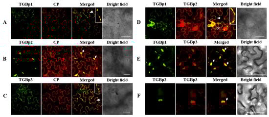 Subcellular colocalization analyses of CYVCV proteins fused with CFPs (green fluorescence) and YFPs (red fluorescence) by transient expression in N. benthamiana leaves and visualization under confocal microscopy. (A–C) Colocalization of CYVCV CP with TGBp1, TGBp2, and TGBp3 at the PD, granular masses and PD, respectively. (D–F) Colocalization of CYVCV paired proteins TGBp1/TGBp2, TGBp1/TGBp3 and TGBp2/TGBp3. White arrows indicate colocalization as aggregates. The PD colocalization (white arrowheads), is highlighted in the boxes at the right upper corner of the corresponding figure panels. Photos were taken at 72 hpi. Scale bar = 25 μm.