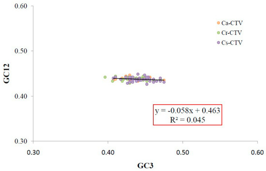 A neutrality plot (GC12 vs. GC3) is used to decrypt the mutation and selection factors associated with codon usage. GC12 represents the average of GC1 and GC2; GC3 represents the abundance of G+C at the third codon position. A GC12 vs. GC3 plot is drawn using GC12 as the ordinate (Y-axis) and GC3 as the abscissa (X-axis). Each dot in the plot represents a CP gene of an individual CTV isolate. In neutrality plots, if the correlation between GC12 and GC3 is statistically significant and the slope of the regression line is close to 1(the points positioned on the diagonal line), then mutation pressure is the key factor behind the CUB. Conversely, a lack of correlation between GC12 and GC3 indicates selection against mutation bias [40].