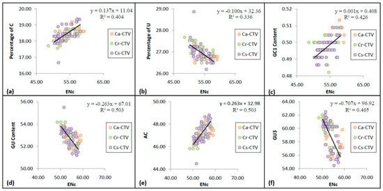 The relationship between CUB and nucleotide composition was investigated through multivariate correlation analysis (Table 2). In the analysis, ENc showed significant positive correlation with GC1, C, and AC (r = 0.610, r = 0.614, and r = 0.659, respectively, at p < 0.01) and significant negative correlation with U, GU, and GU3 (r = −0.595, r = −0.659, and r = −0.646, respectively, at p < 0.01) (Figure 3). It suggests that an increasing G/U nucleotide composition may enhance the CUB that is influenced by the nucleotide compositional constraint in CTV. The significant role of nucleotide compositional constraints in shaping the CUB in many RNA and DNA virus genomes was reported [48,49].