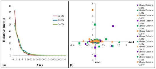 In correspondence analysis (COA), Axis 1 and Axis 2 were found to be main contributors (two main dimensional coordinates) of codon usage, whereby Axis 1 explained 36.21, 24.40, and 26.08% contribution, and Axis 2 explained 18.79, 18.50, and 18.28% contribution for Ca-CTV, Cr-CTV, and Cs-CTV subgroups, respectively (Figure 4a). Axis 1 explains higher usage of 36.21% for Ca-CTV and lesser usage for both the Cr-CTV (24.4%) and Cs-CTV (26.08%). Therefore, Axis 1 was considered to be the major contributor for codon usage in Ca-CTV, indicating higher codon usage variation in CTV isolates originated from C. aurantifolia (Ca-CTV).