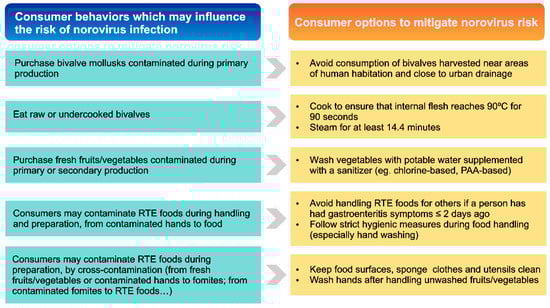 Consumer lack of knowledge on food safety measures contributes to the occurrence of NoV infections, but consumer education and acquisition of specific skills and behaviors may also offer opportunities for intervention to mitigate the risk. In other words, consumer behavior is both a core problem and part of the solution. This review aims at providing an update on the progress made in some of the most important consumer habits and behaviors which may have an effect on NoV risk of infection (Figure 1).