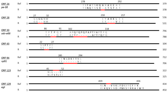 Diagrammatic representation of amino acid sequences representing ORFs with indels in PhopGV-R aligned with the respective ORFs from the reference isolate NC004062. The total amino acid length of each ORF is shown to the right, while the numbers above each insertion/deletion region represent the corresponding amino acids from the aligned reference sequence. Deletions/insertions are indicated by a red bar.