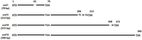 Nucleotide alignment of the four sod types (I–IV). Nucleotide positions and differences are displayed in relation to sod type IV (390 bp). Start and stop codons are underlined.