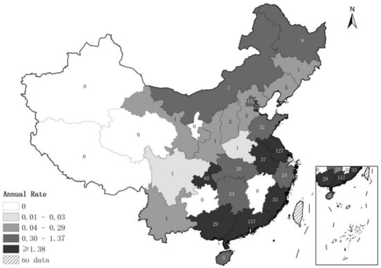 We used ArcGIS 10.3 (Esri, Redlands, CA, USA) to map the annual reporting rates of norovirus outbreaks by province. Population-based reporting rates were calculated for each province using data from the China Census Bureau’s Population Census conducted in 2016 and expressed as outbreaks per 10 million population per year. We calculated the public health resources required to conduct a descriptive analysis of norovirus outbreaks reported to PHEESS based on staff time used for abstracting relevant data from the qualitative narratives. We also described the completeness of the key data elements (i.e., onset date, setting, and transmission mode) from outbreak reports according to the percentage of outbreak reports that included these elements. Statistical significance was assessed using an alpha level of 0.05 for all analyses.