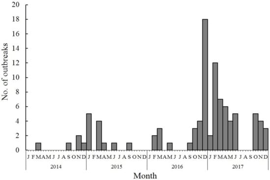 Number of reported norovirus outbreaks by month in China, 2014–2017.
