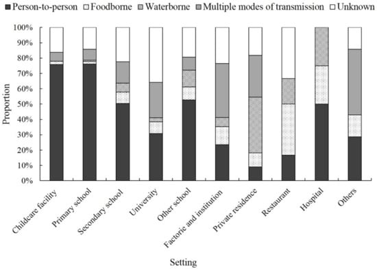 Based on national guidelines [], the transmission mode of norovirus for each outbreak was assigned into one of the following mutually exclusive categories: person-to-person, foodborne, waterborne, or multiple transmission modes.