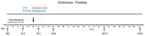 Detailed description of water management and fertilizer application in the experimental fields, and each sampling date. The downward facing arrow indicates that the application of fertilizers was performed on May 20th. Soil samples representing spring fallow period (FP) collection and starting irrigation were performed on the same day. Irrigation began immediately after FP samples collection. FL3, third day of flooding; AF1, 4, 14, 21 refer to the first, fourth, 14th, and 21st days after fertilization, respectively.