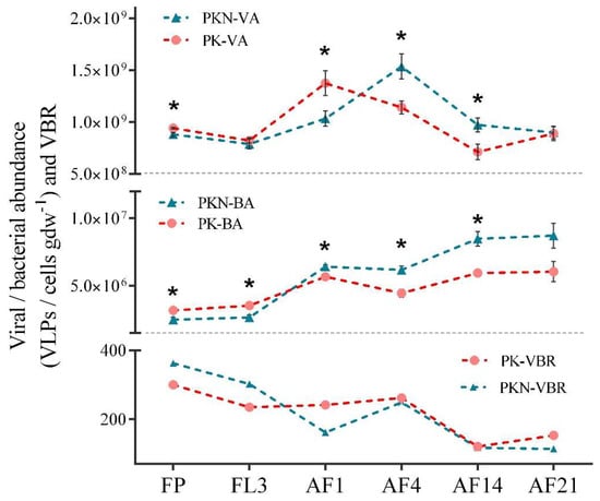 Dynamics in viral abundance (VA), bacterial abundance (BA) and virus-to-bacterium ratio (VBR) in the phosphate and potassium fertilizer (PK) and phosphate, potassium, and nitrogen fertilizer (PKN) groups. The asterisks indicate significant differences are obtained from matched samples (T-test; *, p < 0.05). FP, representing spring fallow period measurements; FL3, third day of flooding; AF1, 4, 14, 21 refer to the first, fourth, 14th, and 21st days after fertilization, respectively.