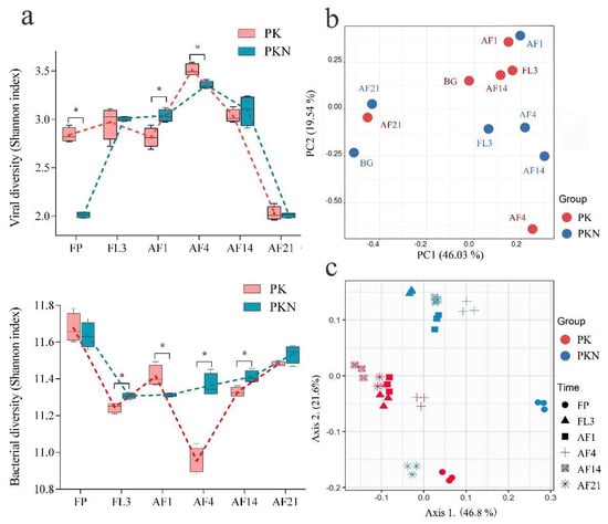 Within 21 days after fertilization, dynamic trends in the viral diversity of the two groups were almost the same (Figure 3a). At AF1, the diversity did not significantly change in either group (PK, p = 0.165; PKN, p = 0.439), which demonstrated that fertilization did not rapidly trigger a large variation in viral diversity under the two treatments. Furthermore, at AF1, viral diversity in the PKN group was significantly higher than that in the PK group (p = 0.009). Viral diversity peaked in the soils under both treatments at AF4 (3.51 in the PK group and 3.35 in the PKN group), and in contrast to that at AF1, the diversity in the PKN group was significantly lower than that in the PK group at AF4 (p = 0.005). In the last two observational days, viral diversity was not different between the two groups (AF14, p = 0.487; AF21, p = 0.647) (Supplementary Materials Table S2). Meanwhile, the viral diversity of both treatments decreased to its lowest point at AF21 (Figure 3a).