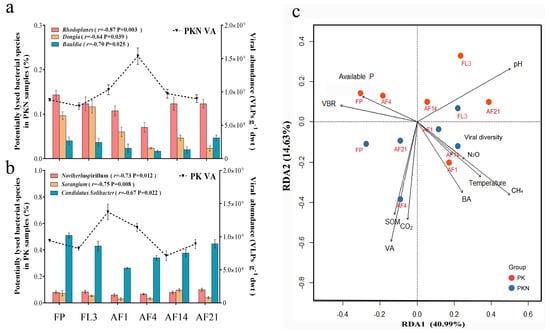 Bacterial community structure driven by potential specific viral predators and related factors. (a,b) The bar plots show the top three bacterial genera which most negatively correlated with the viral abundance (VA) over time (the correlation coefficient and significance are shown in the legends); (c) RDA analysis of all samples, indicating how was bacterial community driven by virus and other environment factors. The percentage of the variance explained by each axis is indicated in parenthesis. Red and blue filled circles indicate bacterial community of PK and PKN groups, respectively. VA, bacterial abundance (BA), VBR (virus-to-bacterium ratio), viral diversity index, microbial processes, and environmental variables are showed by arrows. Arrow length indicates the importance of a corresponding parameter; a small angle between two arrows indicates a strong correlation between the two corresponding parameters. Additionally, “Temperature” means soil temperature at 5 cm depth. “Viral diversity” means viral Shannon index. FP, representing spring fallow period; FL3, third day of flooding; AF1, 4, 14, 21 refer to the first, fourth, 14th, and 21st days after fertilization, respectively.