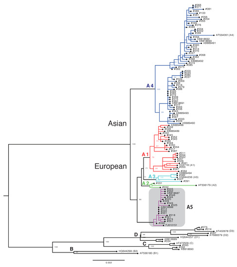 Maximum likelihood phylogenetic tree of Japanese HPV16 isolates. The phylogenetic tree was constructed using whole-genome sequences of 100 Japanese isolates obtained in this study, together with those of 14 Japanese isolates previously determined by us, one Thai isolate, and 10 reference strains for HPV16 variant (sub) lineages. Bootstrap values larger than 70% are displayed. Scale bar, nucleotide substitutions per site. A1, A2, A3, and A4: sublineages; B, C, and D: lineages. Gray area indicates a cluster of A5 variants.