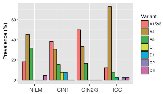 Figure 2 shows the prevalence of HPV16 variant (sub) lineages according to the histological grades of cervical lesions. In NILM, CIN1, and ICC, A4 variants were predominantly detected among variant (sub) lineages, most notably in ICC (30 of 41, 73.2%), whereas A1 variants were most prevalent in CIN2/3 (12 of 24, 50.0%). Regarding A5 variants, their prevalence was highest in NILM (7 of 22, 31.8%), and gradually decreased across CIN1 (2 of 13, 15.4%), CIN2/3 (4 of 24, 16.7%), and ICC (3 of 41, 7.3%).