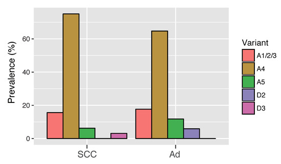 - Nicolas-Parraga, S.; Alemany, L.; de Sanjose, S.; Bosch, F.X.; Bravo, I.G.; RIS HPV TT and HPV VVAP Study Groups. Differential HPV16 variant distribution in squamous cell carcinoma, adenocarcinoma and adenosquamous cell carcinoma. Int. J. Cancer 2017, 140, 2092–2100. [Google Scholar] [CrossRef]