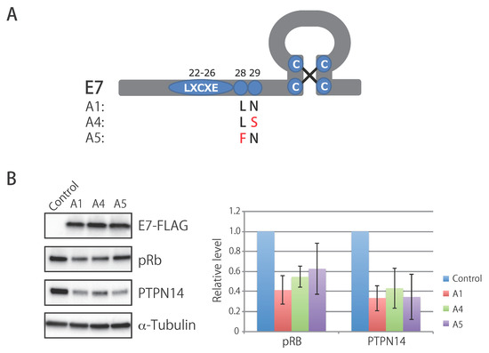 The SNPs in the E7 region specific for A4 and A5 variants were non-synonymous substitutions compared to A1 and lead to amino acid changes in the E7 protein as follows: N29S for A4, and L28F for A5. Since these amino acid residues were in close proximity to the conserved LXCXE motif required for binding to the retinoblastoma protein (pRb) (Figure 4A), we examined whether these E7 variations affected its ability to degrade pRb. To this end, human cervical keratinocytes immortalized with telomerase reverse transcriptase were stably transduced with a retrovirus vector encoding FLAG-tagged E7 proteins of A1, A4, and A5, or an empty vector, and the total cell lysates were analyzed using western blotting. As shown in Figure 4B, similar levels of expression were observed for all three E7 variants. However, while the A1 and A4 variants decreased pRb levels to a similar extent, the A5 variant showed a slightly attenuated ability to degrade pRb, although the difference was not statistically significant. In contrast, all E7 variants similarly reduced levels of PTPN14, another tumor suppressor protein that is targeted by E7 [39,40], indicating that these amino acid residues were not involved in the degradation of PTPN14.