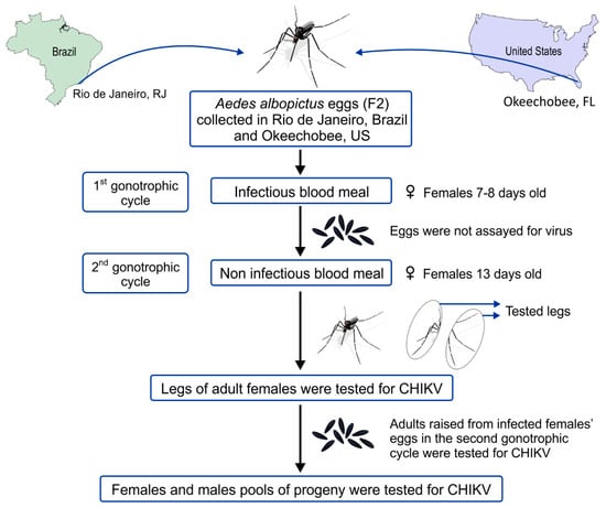 Both Aedes species from Brazil and Florida are considered competent vectors for CHIKV under experimental conditions [,,]. So far, few reports have demonstrated natural infection of Ae. aegypti and Ae. albopictus by CHIKV in the Americas, especially Brazil []. One of the mechanisms by which arboviruses are maintained in nature is called vertical transmission, which can be defined as the direct transference of an arbovirus from one generation to the next [,], more specifically as the transmission of an arbovirus from an infected female mosquito to its offspring, regardless of the underlying mechanism []. Vertical transmission is considered a route of transmission that might allow for persistence of the virus during adverse environmental periods (e.g., dry and cold seasons, severe droughts), where adult mosquito proliferation and indirect transmission of a pathogen from arthropod vector to vertebrate hosts is not favorable, which thus allows for direct transmission (female parent to offspring). Because Ae. aegypti and Ae. albopictus eggs are desiccation-resistant, it is hypothesized that this trait could promote arbovirus survival throughout the year and between transmission cycles, playing an important role in endemic maintenance [,,].