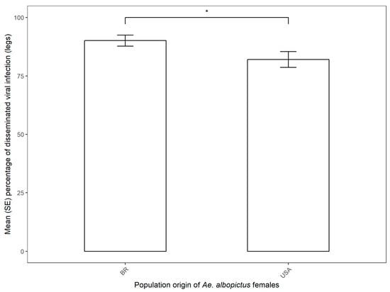 Mean (SE) dissemination rate of CHIKV in Ae. albopictus from Brazilian and Florida populations. Statistical analysis was done via a binomial generalized linear model, with a significant effect of population origin highlighted by the comparison bar (* z < 0.05, ** p < 0.01, *** p < 0.001).
