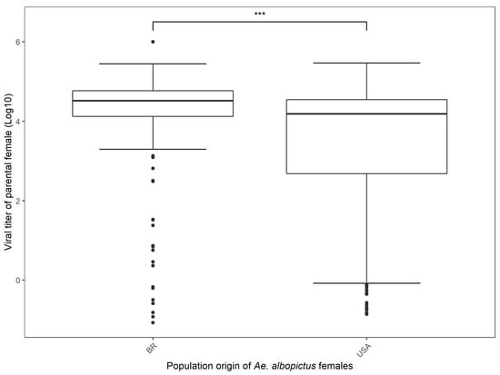 Boxplot of viral titer (log 10) of parental female in Ae. albopictus populations from Brazilian and Florida populations. Statistical analysis was done by a one-way ANOVA, with a significant effect of population origin highlighted by the comparison bar (* p < 0.05, ** p < 0.01, *** p < 0.001).