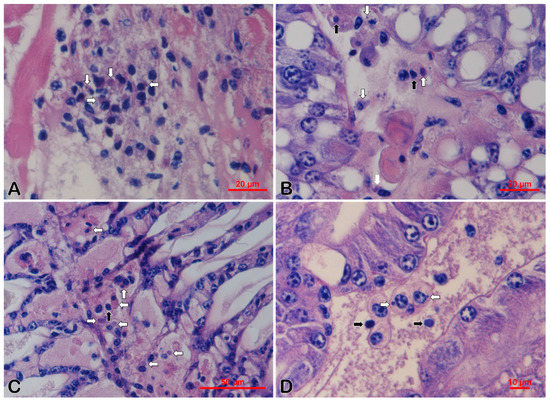 Histopathological features of Davidson’s alcohol-formalin-acetic acid fixative (DAFA) fixed M. rosenbergii (A–C) and M. nipponense (D) samples 20180620. White arrows show the eosinophilic inclusions and black arrows show the karyopyknotic nuclei. (A) Hematoxylin and eosin (H&E) staining of the hematopoietic tissue. (B,D) H&E staining of hepatopancreas. (C) H&E staining of gills. Bar, 20 μm (A,B), 50 μm (C), and 10 μm (D), respectively.