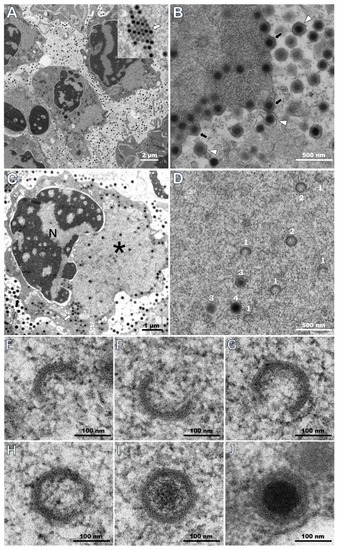 TEM of hematopoietic tissue of naturally infected M. rosenbergii samples 20180620. (A) A large numbers of virions in hematopoietic tissue. (B) DIV1 budded and acquired an envelope from the plasma membrane. (C) DIV1 replication and assembly in hematopoietic cells. (D) The stages of nucleocapsid assembly, which are indicated with numbers 1–3, and a complete nucleocapsid is indicated with number 4. The capsids at stage 2 and 3 should have a small opening at one vertex but may not be visible in the picture due to the ultrathin section. (E) Crescent-shaped structures. (F–I) As the assembling process continues, the crescent-shaped structure curves to form icosahedral capsids. (J) A mature virion with a dense core was eventually formed. N: nucleus; *: a large electron-lucent virogenic stroma; white arrows: paracrystalline array of viral particles; black arrows: budding virions; and white triangles: budded virions that acquired an envelope.