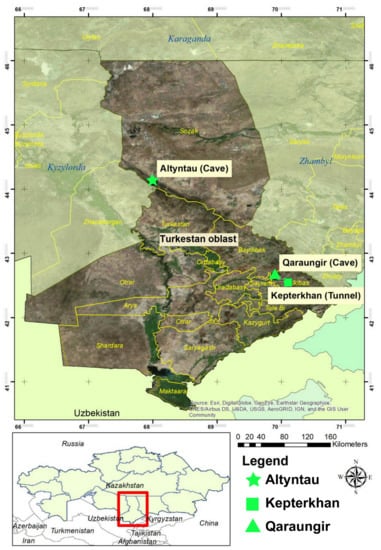 Bat guano was collected from three sites in Turkestan Oblast from 11 April to 16 May 2017. These sites were the Kepterkhan tunnel and Qaraungir cave in Tulkibas Rayon District, with additional guano collected in the Ungirli cave in Altyntau, Sozak Rayon (Figure 1). Bat feces were collected from plastic sheets placed underneath bat roosts. Multiple fecal pellets were placed into cryovials with viral transport media using polyester swabs, which were subsequently placed into a liquid-nitrogen dry shipper and then transferred back to the Research Institute for Biological Safety Problems (RIBSP) in Gvardeiskiy, Kazakhstan, where all samples were stored at −80 °C.