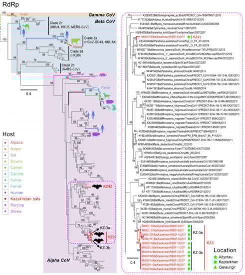 Phylogenetic relationships of the RNA-dependent reverse polymerase (RdRp) gene sequences of coronavirus, inferred using the maximum-likelihood method with the GTR + GAMMA model in RAxML. Representative virus isolates from Alpha-, Beta-, and Gamma-coronavirus (CoV) were included in the analysis. Colored branches and symbols denote viruses collected from different hosts. New CoV sequences generated from this study are marked by red branches. The dotted box indicates Kazakhstan coronavirus lineages (KZ3 and KZ43) described in this study and their closely related viruses isolated worldwide. The inset displays detailed strain names of the Kazakhstan coronaviruses and their closely related viruses. Cave locations are denoted by different shapes in green. Bootstrap support values greater than 50% are displayed at major nodes. The scale bar indicates the number of nucleotide substitutions per site.