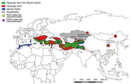 Intense coronavirus surveillance is ongoing in China since the SARS-CoV outbreak, and it was demonstrated that co-roosting can maintain all strains with the necessary components to make SARS []. There is a paucity of bat-borne virus surveillance efforts across central Asia, even though this region is one of the largest grassland biomes in the world. This area is also of interest because it is where the Eurasian and Asian bat populations may be panmictic, as seen in other bat species with large distributions [,]. The range of M. blythii and H. savii is extensive, with both species found from China and northern India through to Spain, and these populations may be co-roosting at multiple sites due to the paucity of roosting areas in the steppe [,] (Figure 3). Myotis blythii is considered an occasional migrant, with movement of greater than 450 km recorded. The migratory behavior of Hypsugo savii is not known []. The potential panmixia and co-roosting of these bat species may lead to a similar mixing of viruses. These results provide a foundation to study bat-borne coronaviruses in Kazakhstan and highlight the need for collaborative efforts in understudied countries to increase integrated surveillance capabilities toward better monitoring and detection of infectious diseases.