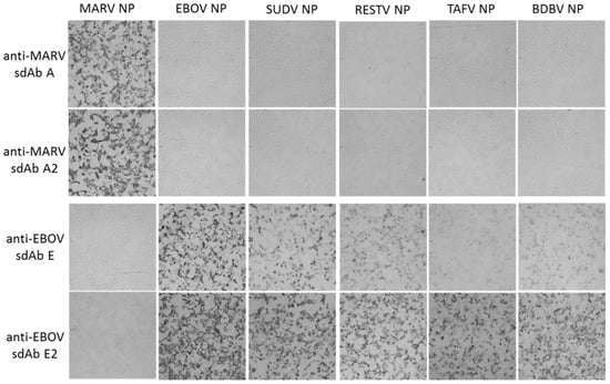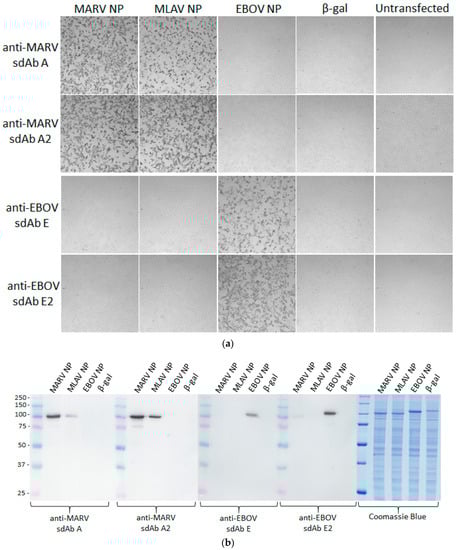 - Sherwood, L.J.; Hayhurst, A. Ebolavirus nucleoprotein c-termini potently attract single domain antibodies enabling monoclonal affinity reagent sandwich assay (MARSA) formulation. PLoS ONE 2013, 8, e61232. [Google Scholar] [CrossRef] [PubMed]