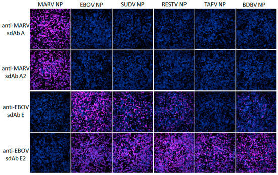 Following the transient expression of recombinant NP genes within HEK293T cells on ibidi 8-well µ-slides, monolayers were probed with 10 nM sdAb–APEX2 fusion proteins and developed with DAB. Figure 2 shows that the anti-MARV sdAb–APEX2 fusion proteins are specific for MARV NP and not cross-reactive with any of the ebolaviral NP proteins. Conversely, the anti-EBOV sdAb–APEX2 fusions are specific for the ebolaviral NP proteins with the dimeric sdAb showing enhanced reactivity over the monomeric sdAb as we move from the cognate EBOV NP to more evolutionary/geographically distant NPs such as Sudan virus (SUDV), Reston virus (RESTV), Taï Forest virus (TAFV) and Bundibugyo virus (BDBV). We repeated the HEK293T probing but developed with Amplex® UltraRed to visualize NPs using fluorescence microscopy to reveal the trend of enhanced reactivity by dimeric anti-EBOV sdAb–APEX2 over monomeric fusion is still evident (Figure 3).