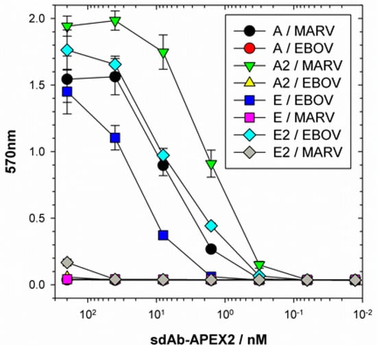 ELISA titration of sdAb–APEX2 monomers (A and E) or dimers (A2 and E2) over purified recombinant MARV or EBOV NP using Amplex®UltraRed substrate and colorimetric recording. Curves represent an n of 2 with error bars +/− SD.
