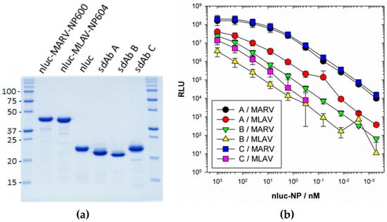 (a) Coomassie-stained 12% SDS-PAGE gel of 10 µg of the monovalent binding assay component proteins; sdAb, nluc and nluc–NP C-terminal domain. Molecular weights of markers are indicated to the left in kDa. (b) Titrations of fusions of nluc–NP C-terminal domains of either MARV or MLAV over oriented sdAb A, B or C with curves representing an n of 3 with error bars +/− SD. EC50 values +/− SD calculated for MARV were; sdAb A, 21.5 +/− 3.0 nM; sdAb B, 274.7 +/− 39.5 nM; sdAb C, 21.0 +/− 2.5 nM. These compare favorably with our previous determinations using this assay format; sdAb A, 24.7 +/− 6.1 nM; sdAb B, 131.6 +/− 33.1 nM; sdAb C, 32.0 +/− 1.0 nM [18].