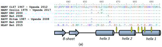 (a) Alignment of amino acid sequences of representative naturally occurring human or bat MARV and RAVV NP C-termini with date ranges of sampling, with the Kween MARV outbreak in 2017 [24] and MLAV [20] updating Figure 5a of [18]. Shown below are the secondary structures occurring in our Musoke crystal structure. Numbering uses the MARV/RAVV scheme since MLAV has two extra amino-acids elsewhere in NP. Mutations predicted to directly impact sdAb contacts are indicated with yellow ovals. MARV Musoke 1980, Angola 2005, and Leiden 2008 are equivalent to Ci67 in the region of NP shown (i.e., residues 632–695). (b) Pymol [25] rendering of a cartoon of the MARV Musoke NP C-terminal domain as bound by sdAb A (PDB ID: 6APP_B), with residues predicted to mutate between MARV and MLAV shown in yellow as lines (non-sdAb contacts) or sticks (contacts).