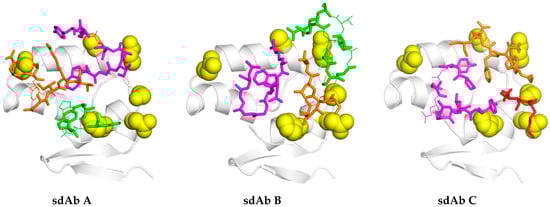 Top-down view of the epitope for each sdAb with MARV > MLAV variable residue side-chains predicted to be major contacts shown as yellow spheres. Only the CDR loops are shown as sticks (contacts) or lines (non-contacts) and colored; CDR1, orange; CDR2, green; CDR3, purple. In the sdAb C complex framework 1 (FR1) contacts are shown in red which for chains E and F involve Lys1 and Val2 though in chains A and B only involves Lys1 via non-bonded contacts to Glu687 and Asp686.