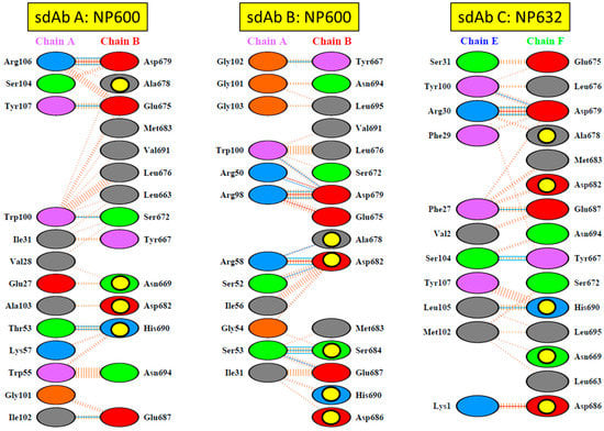 Schematic interaction maps of the three anti-MARV sdAb with the MARV Musoke NP C-terminus based on analysis of sdAb A/NP600 (PDB ID: 6APP), sdAb B/NP600 (PDB ID: 4W2O), sdAb C/NP632 (PDB ID: 4W2Q) using PDBSum. Residues are labelled as follows; Positive = His, Lys, Arg; negative = Asp, Glu; neutral = Ser, Thr, Asn, Gln; aliphatic = Ala, Val, Leu, Ile, Met; aromatic = Phe, Tyr, Trp; Pro, Gly. Interactions are labelled as follows; salt bridges, red lines; hydrogen bonds, blue lines; non-bonded contacts, striped brown lines with the width of the lines proportional to the number of atomic contacts. The yellow circles highlight those residues that are mutated in the MLAV NP.