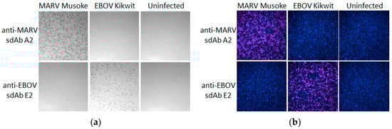 Dimeric sdAb–APEX2 fusions at 10 nM were used to probe Vero cells 24 h post-infection with either MARV Musoke or EBOV Kikwit for development using (a) DAB or (b) Amplex®UltraRed. Magnification was at 10×.