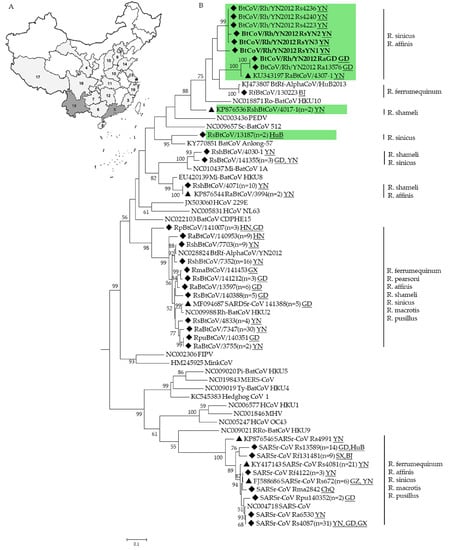 Sampling map (A) and phylogenetic analysis of CoVs detected in Rhinolophus bats (B). A total of 19 provinces (indicated in gray) in China were involved. 1. Beijing (BJ); 2. Chongqing (CA); 3. Fujian (FJ); 4. Gansu (GS); 5. Guangdong (GD); 6. Guangxi (GX); 7. Guizhou (GZ); 8. Hainan (HaN); 9. Hebei (HeB); 10. Henan (HeN); 11. Hubei (HuB); 12. Hunan (HuN); 13.Jiangsu (JS); 14.Shandong (SD); 15.Shanxi (SX); 16. Sichuan (SC). 17. Tibet (T); 18. Yunnan (YN); and 19. Zhejiang (ZJ). The partial sequences of RdRp gene (327-bp) of CoVs detected in Rhinolophus bats were aligned with those of published representative CoV strains. The tree was constructed by the maximum-likelihood method with bootstrap values determined with 1000 replicates. The scale bar indicates the estimated number of substitutions per 10 nucleotides. Filled triangles indicate the CoVs published previously by our lab (KU343197, KP876536, KP876544, MF094687, KP876546, KY417143, FJ588686) [,,,], filled diamonds indicate CoVs detected in this study. Putative novel alphaCoVs are labeled in green. BtCoV/Rh/YN2012 detected in Guangdong and Yunnan province in this study are in bold. FIPV, Feline infectious peritonitis virus; PEDV, porcine epidemic diarrhea virus; MHV, mouse hepatitis virus. Other abbreviations are defined as those in the text. Numbers in parentheses indicate numbers of sequences sharing >97% identity.