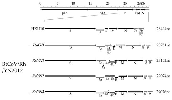 Schematic diagram of genomic organization of BtCoV/Rh/YN2012. The genomic regions or ORFs of BtCoV/Rh/YN2012 were compared with BatCoV HKU10. Solid bars indicate conserved genes and grey letters indicate species or group-specific genes. Hollow arrowheads indicate distinct array of accessory genes (Grey hollow arrowheads: RaGD; black hollow arrowheads: RsYN1, RsYN2, and RsYN3). Upper letters indicate structural proteins and lower letters indicate nonstructural proteins (p1a and p1b) and accessory proteins. HKU10, Ro-BatCoV HKU10.