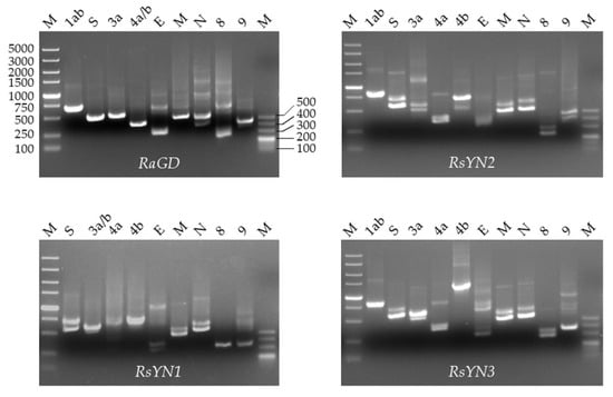 Subgenomic structure of 4 stains of BtCoV/Rh/YN2012. Agarose gel electrophoresis of the PCR products of subgenomic mRNA. The lowest band on each lane was the specific amplicon of each subgenomic mRNA. Other bands are amplicons of first-round PCR products or upper subgenomic mRNAs.