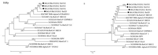 Phylogenetic trees generated based on aa sequences of RdRp and S. Trees were constructed by the maximum likelihood method using the Poisson model with bootstrap value determined with 1000 replicates. The scale bar indicates the estimated number of substitutions per 10 amino acids. Filled diamonds indicate viruses detected in this study.