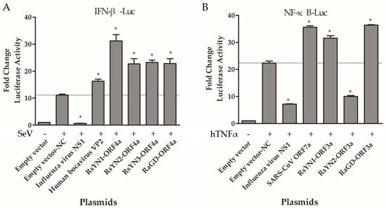 HEK 293T cells were seeded in 24-well plates and then co-transfected with reporter plasmids (pRL-TK and pIFN-βIFN- or pNF-κB-Luc) [], as well as plasmids expressing accessory genes, empty vector plasmid pcAGGS, influenza virus NS1 [], SARS-CoV ORF7a [], or HBoV VP2 []. At 24 h post transfection, cells were treated with Sendai virus (SeV) (100 hemagglutinin units [HAU]/mL) or human tumor necrosis factor alpha (TNF-α; R&D system) for 6 h to activate IFNβ or NF-κB, respectively. Cell lysates were prepared, and luciferase activity was measured using the dual-luciferase assay kit (Promega, Madison, WI, USA) according to the manufacturer’s instructions.