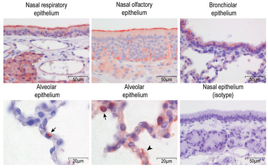 Dipeptidyl peptidase-1 (DPP4) expression in the respiratory tract tissues of rabbits. DPP4 is detected using immunohistochemistry and indicated in red in the figure. Type II cells are indicated with arrows, and type I cells with an arrowhead. Nasal epithelium and bronchiolar epithelium pictures were taken at a 400× magnification, and alveolar epithelium at 1000×. The isotype control showed no background signal in our assay.