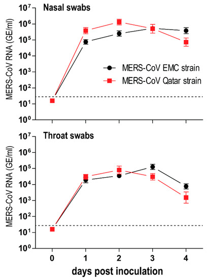 Middle East respiratory syndrome coronavirus (MERS-CoV) EMC strain and Qatar15 strain replicate equally in the upper respiratory tract of rabbits. Five New Zealand rabbits were each intranasally inoculated either with 1 mL of 1 × 106 TCID50/mL MERS-CoV EMC strain or Qatar15 strain. Nasal and throat swabs were obtained from day 0 (before inoculation) until day 4 post inoculation. The amount of viral RNA is displayed in genome equivalents per mL (GE/mL). Dashed lines depict the detection limit of the assay. All error bars represent standard deviations.