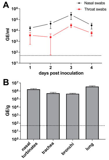 Middle East respiratory syndrome coronavirus (MERS-CoV) infects the upper and lower respiratory tract of Netherland dwarf rabbits. The amount of viral RNA in the nasal and throat swabs (A) as well as in the respiratory tract tissues (B) are displayed in genome equivalents per mL (GE/mL) and genome equivalents per gram tissues (GE/g), respectively. Dashed lines depict the detection limit of the assays. All error bars represent standard error of means.